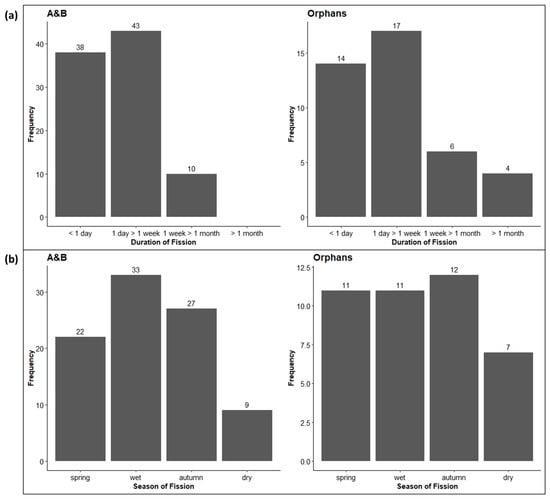 (a) The duration of fission events for the A&B herd and the Orphans. (b) The seasonality of fission events throughout the year. Numbers above bars indicate the number of scans in each category. Seasons: spring = September–October, wet = November–February, autumn = March–May, and dry = June–August.