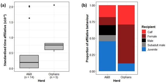 The less cohesive Orphans were also expected to demonstrate less affiliative behaviours towards one another as social bonds were assumed to be weaker. However, when standardised by group size, the Orphans spent significantly more time exhibiting affiliative behaviours than the A&B herd (Wilcoxon rank sum test: W = 12, p < 0.05) (Figure 6a). Further, the recipients of affiliative behaviours significantly differed between the A&B herd and the Orphans (Chi-squared test: X2 = 17.25, df = 4, p < 0.01). The Orphans directed a higher proportion of affiliative behaviour towards herd mates (other adult females, calves, and juveniles within their herd) than the A&B herd, who rather directed affiliative behaviour more often towards males (Figure 6b).