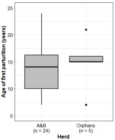 Age of the first parturition of females in the A&B herd and the Orphans. Boxplots show median, IQR, and outliers. Numbers on the x-axis indicate the number of individuals included in the analysis for each herd.