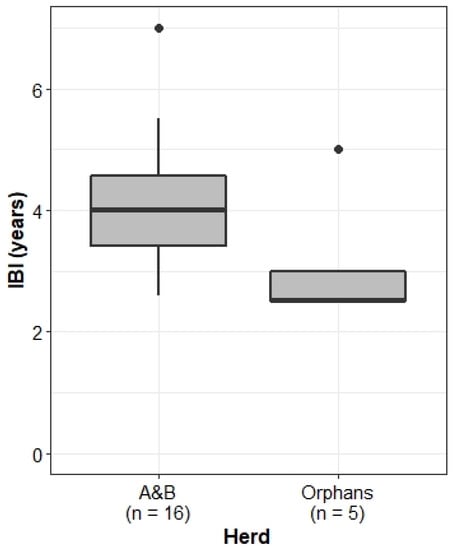 The Orphans did, however, exhibit significantly shorter inter-birth intervals than the A&B herd (Wilcoxon rank sum test: W = 64.5, p-value < 0.05; Figure 8).
