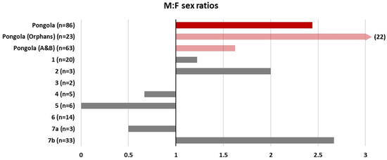 The Orphans’ skewed sex ratio led us to compare with other reserves that are home to socially disrupted elephant populations. Although the mean sex ratio across the reserves did not significantly differ from the expected 1:1 ratio (one-sampled t-test: t = 0.92, p = 0.39), it does appear that in a number of reserves, there is a trend towards more males being born (Figure 9), and only two reserves had the expected 1:1 sex ratio.
