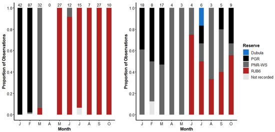 The movement of the A&B herd (Left) and Orphans (Right) during 2016. Bars indicate the proportion of observations in each reserve. For a map of the reserves, see Figure 1 and refer to the Methods section. Note that no observations were made of the A&B herd during April 2016.