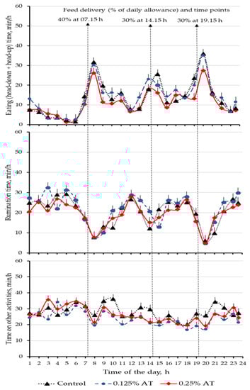 Data on the eating–rumination behaviour is presented in Table 2, with diurnal fluctuation in eating–rumination behaviour presented in Figure 1. Overall, the daily time allocation (min/d) for eating in the head-up position, rumination and other activities was not different among the dietary treatments. The observed eating times in our study were comparable with previous reports for indoor fed dairy cows with comparable body weight (e.g., 600 kg) and consuming over 20 kg DM/day [28,29,30,31], but considerably lower than NRF cows grazing on summer pasture [3]. Notably, daily eating time with the head-down position linearly increased (p = 0.009) with the increasing AT inclusion level from 0 to 0.25%, with the total eating time (summed up as eating head-up and eating head-down; p = 0.042) showing a similar trend. These observed differences were against the lower DMI in the 0.25% AT inclusion level. The observed greater eating time in the 0.25% AT group could be due to increased feed searching as manifested by eating in the head-down position (control < 0.125% AT < 0.25% AT; following linear trend, p = 0.009).
