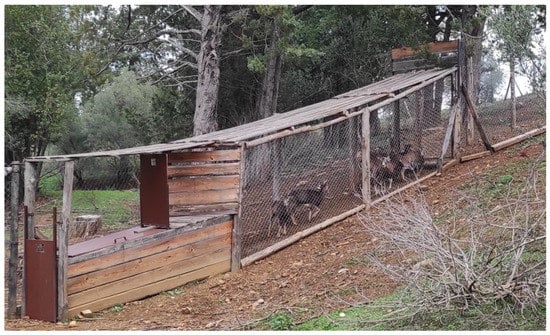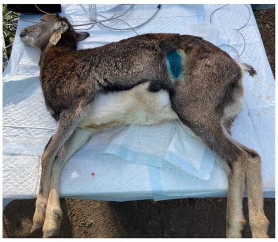 This study enrolled 13 female mouflons. All of the translocated animals, with the exception of one animal born at the same Reserve, came from Giglio Island, as a result of activities conducted with the project LIFE18NAT/IT/000828 LETSGO GIGLIO “Less alien species in the Tuscan Archipelago: new actions to protect Giglio island habitats”. They were transferred to the Marsiliana Nature Reserve about a month before the surgery. The animals were housed in an enclosure of about three hectares, in which there was a funnel-shaped enclosure ending in a crate-shaped device with a guillotine opening to contain the animals (Figure 1). All animals were in good, alert condition and had a body condition score (BCS) of between 3 and 3.5 out of a maximum of 5 [8], and they were between 18 and 28 months old (mean ± standard deviation SD: 22.85 ± 3.55), and weighed between 15 and 18 kg (mean ± SD: 16.61 ± 1.19).