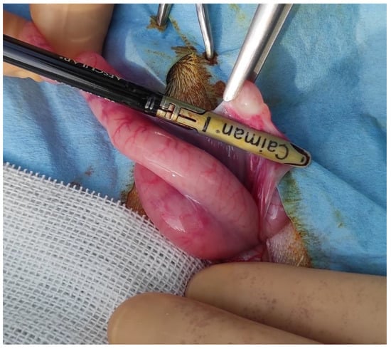 Food and water were withheld from the patients for 24 h and 12 h prior to surgery, respectively. The day before the surgery, the animals were captured in a funnel-shaped enclosure to facilitate operations and minimize stress. The day of surgery, the animals were captured from the enclosure by three operators and contained for premedication. The anesthesia was performed using xylazine (Nerfasin® 20 mg/mL, ATI, Ozzano dell’Emilia, Italy) 0.1 mg/kg and an association of tiletamine and zolazepam (Zoletil® 50/50 mg/mL, Virbac, Milan, Italy) 4 mg/kg, mixed in the same syringe and injected in the brachiocephalicus muscle. After approximately 10 min, upon reaching a state of deep sedation, a 20-G venous catheter (DeltaVen®, DeltaMed S.p.A., Viadana, Italy) was inserted in the cephalic vein to start a maintenance fluid therapy (3 mL/kg/h of ringer with lactate, with possible variations during surgery, depending on the hemodynamic needs). Propofol (PropoVet Multidose® 10 mg/mL, Zoetis Italia S.r.l., Rome, Italy) at 2 mg/kg was loaded into the syringe and was administered intravenously to allow orotracheal intubation, and anesthetic maintenance was performed with isoflurane (Isoflo®, Zoetis Italia S.r.l., Rome, Italy), vaporized in 100% oxygen, in an open anesthesia system (MedVet S.r.l., Taranto, Italy), always performed by the same anesthesiologist. All patients were connected to a re-breathing respiratory circuit and were allowed to breath spontaneously. This protocol was in accordance with that described by Caulkett and Haigh (2007) [9]. During the perioperative period, the animals were continuously monitored through multiparametric monitoring of the heart rate (HR), respiratory rate (RR), non-invasive blood pressure (BP), oxygen hemoglobin saturation (SpO2), and body temperature (T). In the event of increases in these parameters (>25% compared to the pre-incision values) during the procedure in response to the surgical pain, a bolus of fentanyl would be administered intravenously at 2 μg/kg (Fentadon®, Dechra Veterinary Products S.r.l., Torino, Italy) as rescue analgesia.