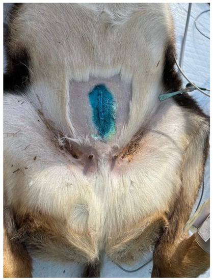 Intramuscolar (IM) injection of 10,000 UI/kg benzilpenicilline and 12.5 mg/kg dihydrostreptomicine (Repen, Fatro S.p.A., Ozzano dell’Emilia, Italy; 200,000 UI + 250 mg/mL) was administered 10 min after the premedication to provide antibiotic coverage. Moreover, at the end of the surgery subcutaneous (SC) injection of triidrate amoxicilline (Betamox LA 150 mg/mL, Vètoquinol Italia S.r.l., Bertinoro, Italy) 15 mg/kg and the IM injection of 0.3 mg/kg ketoprofen (Zooketo 100 mg/mL, Elanco Italia S.p.A., Milan, Italy) were administered as the antibiotic and anti-inflammatory coverage for the post-operative period.