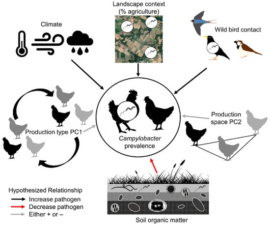 Hypothesized relationships between Campylobacter spp. prevalence, climate (temperature, wind speed, humidity), landscape context (% agriculture), wild bird contact, production type PC1, production space PC2, and soil organic matter. Arrows indicate if the hypothesized relationship is positive (black), negative (red), or uncertain (gray).