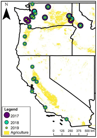 Map showing locations of farms surveyed each year of the study (2017–2019) in the USA states of California, Oregon, Washington, and Idaho. Year(s) each farm was surveyed indicated by color and size: large, purple circle = 2017; medium, teal circle = 2018; small, lime green circle = 2019. Yellow background indicates agricultural land use.