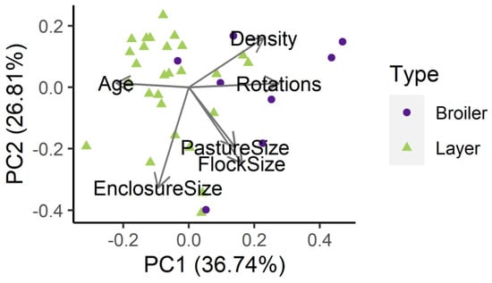 Because farm management variables were correlated (Figure S2), we used principle component analysis (PCA) to assess relationships among farm management variables using the prcomp function in R version 3.6.3 [38], as previously described in [13]. To account for the variation in scale among metrics in the PCA, variables were z-score transformed prior to analyses to improve model convergence by taking [(X−)/sd], where X is the raw data for the sample, is the mean value calculated across all samples, and sd is the standard deviation for the variable calculated across all samples. The first four principal components (PC) combined accounted for 91.3% of the variation: PC1, PC2, PC3, and PC4 accounted for 36.7%, 26.8%, 16.0%, and 11.8% of the variation, respectively. We used the first two PCs in subsequent analyses. Increasing values of PC1 were associated with younger birds, more rotations per year, and higher flock densities, which we label as “production type PC1” (Figure 3). Flocks with low PC1 values were typically egg-laying hens, while high values of PC1 were typically broiler flocks. Increasing values of PC2 were primarily associated with larger enclosure sizes, larger pastures, and larger flocks, which we label as “production space PC2.”