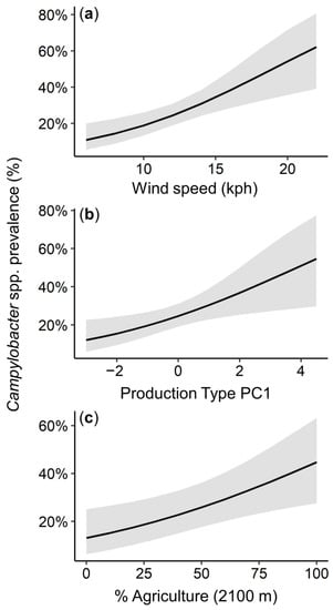 Campylobacter spp. prevalence was predicted to increase with (a) increasing wind speed (kph), (b) when flocks had high production type PC1 values, and (c) when farms were embedded in more agricultural landscapes (2100 m radius). Gray area shows +/− 95% confidence intervals.