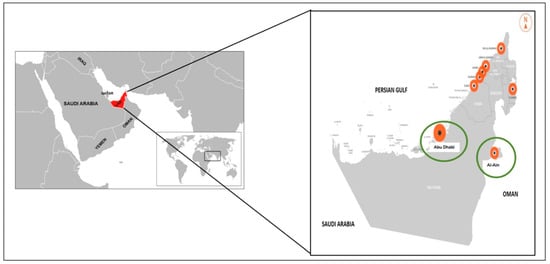 United Arab of Emirates (UAE) map showing Al-Ain and Abu-Dhabi cities (in green circles) involved in this study.