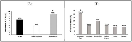 (A) Prevalence of feline coronavirus (FCoV) in cats (all cats, mixed-breed cats, and purebred cats). (B) Prevalence of feline coronavirus (FCoV) in different purebred cats (British short hair, Himalayan, Scottish fold, Turkish Angora, Persian, and Siamese). * statistically significant difference (p ≤ 0.05).