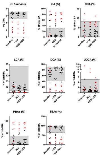 Dot plots showing the abundance of C. hiranonis (log DNA) and concentrations of the bile acids (BA, % of total) in canine fecal samples collected from dogs during the first visit (baseline), after receiving a home-cooked diet for 7 days (HCD), and after supplementation with virgin coconut oil (HCD + VCO). The black horizontal line represents the median. The grey shaded area corresponds to the internal reference intervals established for healthy dogs. The red dots represent dogs with low C. hiranonis abundance, while the black dots represent dogs with normal C. hiranonis abundance. Abbreviations: PBAs, primary bile acids [CA, cholic acid; CDA, chenodeoxycholic acid]; SBAs, secondary bile acids [LCAs, lithocholic acid; DCAs, deoxycholic acid; UDCAs, ursodeoxycholic acid].