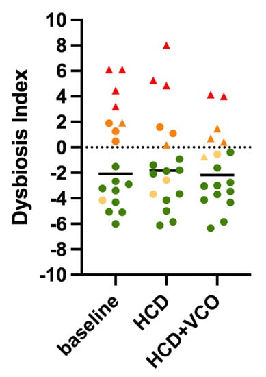 Dot plots showing the Dysbiosis Indexes (DIs) of canine fecal samples collected from dogs during the first visit (baseline), after receiving a home-cooked diet for 7 days (HCD), and after supplementation with virgin coconut oil (HCD + VCO). The black horizontal line represents the median. Interpretations for DI: <0 = normal; 0−2 = mildly increased; >2 = significantly increased. Graphic representations of the alterations (intended as deviation from the internal reference interval) of the selected bacterial populations, based on qPCR: green dots, normal; yellow dots, minor changes (defined as DI < 0 but some bacterial taxa outside their respective reference interval); orange dots, mild-to-moderate changes; red dots, significant changes. The triangles represent dogs with low C. hiranonis abundance.