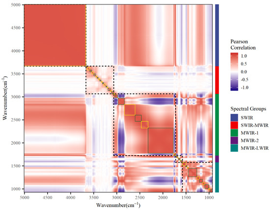 The correlation heatmap of wavenumber absorbances across 1060 wavenumbers ranging from 5010.15 to 925.66 cm−1. SWIR, short-wavenumber infrared or near-infrared; MWIR, mid-wavenumber infrared; LWIR, long-wavenumber infrared.