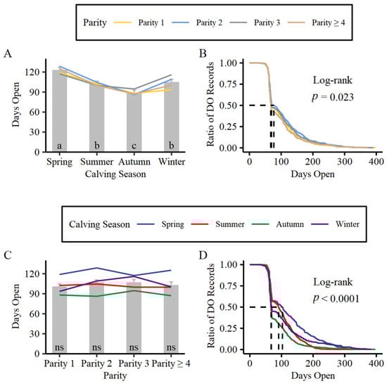 Least-squares means and corresponding standard error of DO at different levels of calving season (A) and parity (C) inferred by linear mixed model. Survival analysis of DO based on parity (B) and calving season (D) was carried out by the Kaplan–Meier method. The horizontal dotted line indicates the median survival rate in survival analysis. The vertical dotted lines indicate the median survival time at different levels of parity and calving season in survival analysis. Different letters show significant differences (p < 0.05)