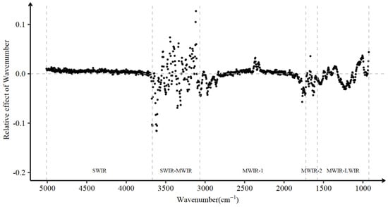 Wavenumbers in the SWIR region from 5010.15 to 3671.80 cm−1 had a relatively stable and near-zero relative effect on DO. This means that molecules in the milk whose chemical bonds interact with wavenumbers in this region were barely related to DO. The SWIR-MWIR region and the MWIR-2 region spanning from wavenumber 3667.94 to 3050.83 cm−1 and 1697.05 to 1585.20 cm−1, respectively, are characterized by the high variability of absorbances due to the absorption of water molecules. The effects of wavenumbers in the SWIR-MWIR region were evenly distributed around zero, but the effects of wavenumbers in the MWIR-2 region preferred to be slightly negative. A reasonable explanation for this phenomenon is that the high correlations between adjacent wavenumbers was extrapolated to the effects of wavenumbers on DO. Most wavenumbers located in the boundaries of the MWIR-1 region (wavenumbers from 3046.97 to 2641.99 cm−1 and 1978.60 to 1700.90 cm−1) had a negative effect on DO. The boundaries also contain absorption peaks for fat-B and fat-A, which range from 2873 to 2777 cm−1 and 1786 to 1725 cm−1, respectively [54,55,56]. Moreover, the absorbance of wavenumbers ranging from 2306.44 to 2387.44 cm−1 was positively associated with DO. The MWIR-LWIR region, known as the fingerprint region, is an important region for the prediction of milk components [57]. Wavenumbers from 1546 to 1492 cm−1 represent the absorption peaks of proteins in milk [54,56], and these wavenumbers had a negative effect on DO. Three wavenumbers at 1461.77 cm−1, 1238.07 cm−1 and 1110.79 cm−1 in this region exhibited a negative local minimum effect on DO, and these three wavenumbers have been reported to be related to the absorption of urea (1469 cm−1), fat (1460 cm−1), acetone (1238 cm−1), and lactose (1040 cm−1), respectively [54,56].