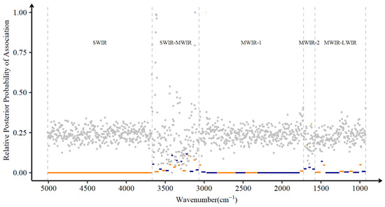 The posterior probability of association (PPA) was also used to evaluate the associations between wavenumbers and DO. The marginal PPA of 1060 wavenumbers, as well as the joint PPA of windows clustered with highly correlated wavenumbers, were inferred by the BayesB model.