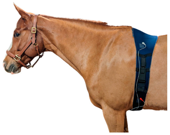 Horses were instrumented with a smart textile girth band (Skiin Equine, Myant Inc., Toronto, ON, Canada; Figure 1) and a telemetric ECG device (Televet 100, Jørgen Kruuse, Denmark). The smart textile band had five 4 cm square electrodes composed of silver- and carbon-coated yarns, arranged in a modified base-apex configuration, as previously described [18]. The Ag/AgCl electrodes were placed underneath the textile band, against the skin, and directly above the textile electrodes, to maintain continuity between the three leads, without electrode overlap. The skin was not prepared, and the hair was not shaved prior to application of either electrode type. Both the textile and Ag/AgCl electrodes had a salt- and chloride-free, electrically conductive gel (Spectra 360 Electrode Gel, Parker Laboratories Inc., Fairfield, NJ, USA) applied. A surcingle was mounted on top of the textile band, with the Televet recording device was attached to it.
