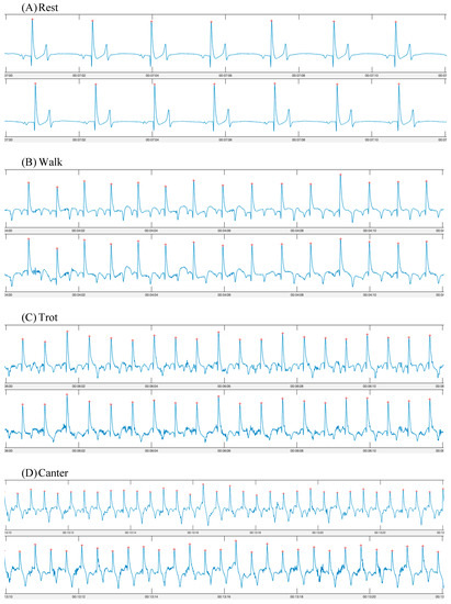 ECG traces obtained using a smart textile device (Myant—top row) and a standard telemetric device (Televet—bottom row). ECGs were obtained simultaneously during (A) rest; (B) walk; (C) trot; (D) canter.