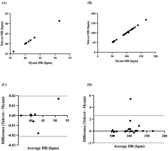 Correlation between two ECG devices (Myant, Televet) for mean HR at rest (A) and during exercise (B). Bland–Altman plots demonstrating the agreement between the two devices for mean HR at rest (C) and during exercise (D), where x-axes are the average of HR for each device, y-axes are the difference of Televet minus Myant HR, solid lines indicate bias, and dashed lines indicate 95% limits of agreement.