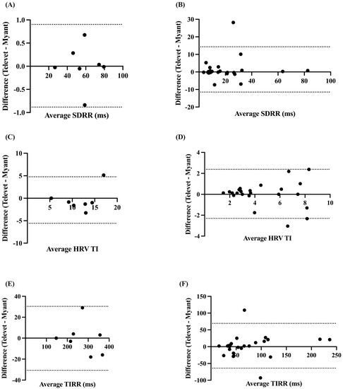 Bland–Altman plots demonstrating the agreement between the two devices for HR metrics at rest (A,C,E) and during exercise (B,D,F). SDRR = standard deviation of R-R intervals; HRV TI = heart rate variability triangular index; TIRR = triangular interpolation of the R-R interval histogram. X-axes are the average of each metric for each device; y-axes are the difference of Televet minus Myant for each metric. Solid lines indicate bias and dashed lines indicate 95% limits of agreement.