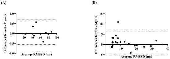 Bland-Altman plots demonstrating the agreement between the two devices for root mean square of successive R-R interval differences (RMSSD), at rest (A) and during exercise (B). X-axes are the average of RMSSD for each device; y-axes are the difference of Televet minus Myant RMSSD. Solid lines indicate bias and dashed lines indicate 95% limits of agreement.
