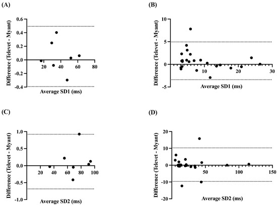 Bland–Altman plots demonstrating the agreement between the two devices for nonlinear HRV parameters at rest (A,C) and during exercise (B,D). SD1 = Poincaré plot standard deviation perpendicular to the line of identity; SD2 = Poincaré plot standard deviation along the line of identity. X-axes are the average of SD1 or SD2 for each device; y-axes are the difference of Televet minus Myant SD1 or SD2. Solid lines indicate bias and dashed lines indicate 95% limits of agreement.