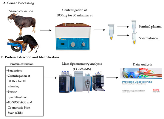Scheme of the proteomic analysis of Bali bull seminal plasma. (A) Semen collection process for Bali bulls. (B) Protein extraction and identification.