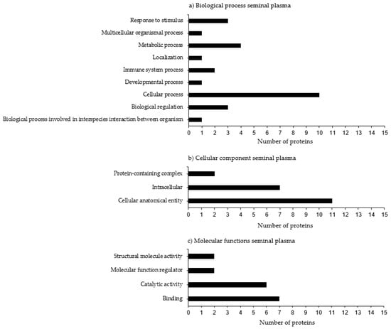 Several studies have reported the content and complexity of proteins in seminal plasma related to fertility [10,11,12]. Proteomics has been used to demonstrate differences in seminal plasma proteins derived from bulls of higher and lower fertility [13]. The proteomic approach is efficient for screening the total proteins in spermatozoa [14]. Proteomics has emerged as a technology in biomarker discovery [15,16]. Seminal plasma proteins are important for the maintenance of spermatozoa function [17]. Seminal plasma proteins have been characterized in sheep [18], Bos taurus cattle [19], pigs [20], buffalo [21], and horses [22]. Cell protection, motility, spermatozoa capacitation, acrosome reactions, fertilization, and embryonic development are some of the functions associated with seminal plasma proteins that have been previously reported [19].