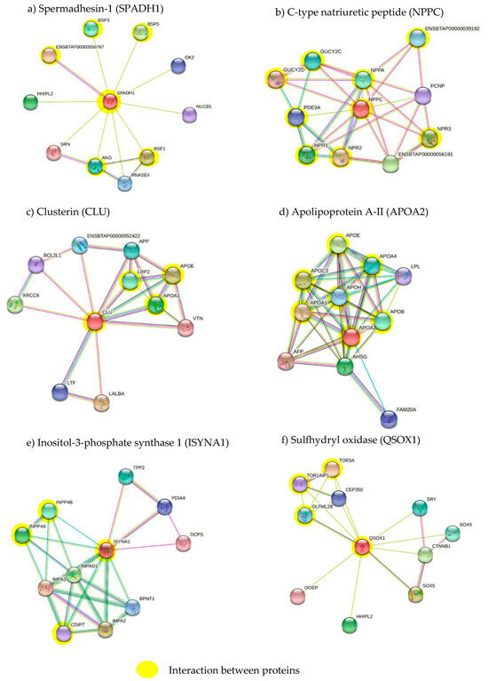 Interactions of the seminal plasma proteins related to sperm fertility: (a) Spermadhesin-1 (SPADH1); (b) C-type natriuretic peptide (NPPC); (c) clusterin (CLU); (d) apolipoprotein A-II (APOA2); (e) inositol-3-phosphate synthase 1 (ISYNA1); (f) sulfhydryl oxidase (QSOX1).