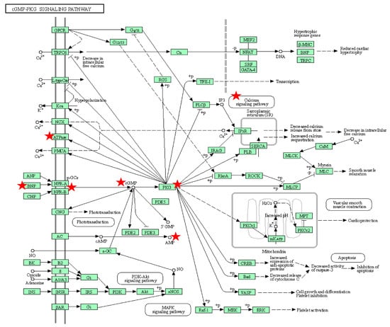 Cyclic GMP (cGMP) is an intracellular agent that mediates nitric oxide (NO) and natriuretic peptides (NPs), and it regulates a wide variety of biological processes (Figure 4). Increased intracellular cGMP levels provide physiological signals through two cycle pathways, namely, the cGMP-protein kinase G (PKG), cGMP-regulated phosphodiesterase (PDE2, PDE3), and cGMP-gated cation channels, among which PKG is the main mediator. The specific activation of PKG1 from the formed substrate leads to a reduction in the cytosolic calcium concentration and a decrease in myofilament sensitivity to Ca2+ (Ca2+ desensitization). Qu et al. [55] found that the zinc-alpha-2-glycoprotein in sperm can bind to spermatozoa and speed up their movement through the cAMP pathway.