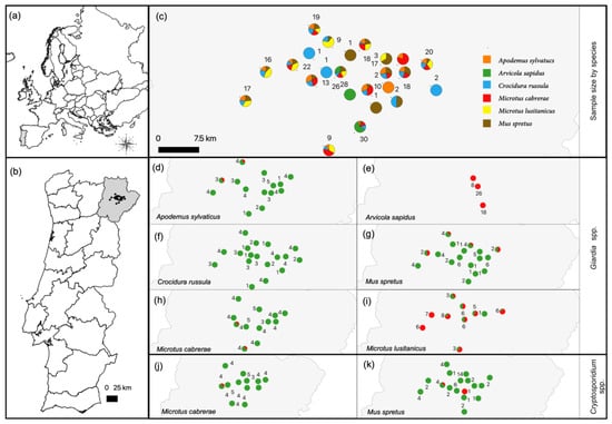 (a) Map of Europe. (b) Map of Portugal, including the study area in the Trás-os-Montes region, Northeast Portugal. (c) Location of the 24 sampling units centered in olive grove patches, proportion of surveyed small mammal species per unit and number of animals per unit. (d–i) Proportion of Giardia spp.-positive (red) and -negative (green) animals per sampling unit for each host species. (j,k) Proportion of Cryptosporidium spp.-positive (red) and -negative (green) animals per sampling unit for Microtus cabrerae and Mus spretus. Common names of small mammal species are as follows: wood mouse (Apodemus sylvaticus), southwestern water vole (Arvicola sapidus), greater white-toothed shrew (Crocidura russula), Algerian mouse (Mus spretus), Cabrera’s vole (Microtus cabrerae) and Lusitanian pine vole (Microtus lusitanicus).