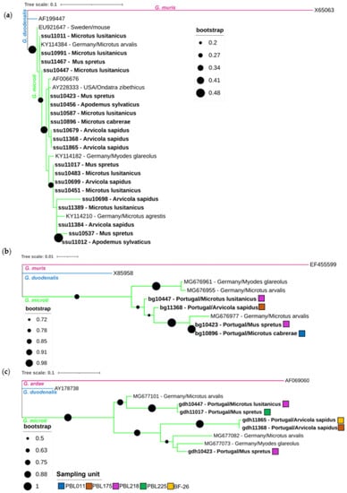 Phylogenetic analysis of SSU rRNA (a), bg (b) and gdh (c) gene sequence fragments of Giardia microti characterized in this study (represented in bold) and sequences downloaded from GenBank. Inference was performed using a maximum-likelihood method and the Tamura-3-para-meter model, with discrete gamma distribution (alignment length of SSU rRNA: 214 nucleotides; bg 478 nucleotides; gdh 370 nucleotides). Bootstrap values from 1000 replicates are shown at the nodes and for (b,c), only bootstrap values above 50% are shown. Analyses were conducted via MEGA X, with editing via the Interactive Tree of Life (iTOL). The reference sequences (GenBank accession numbers) for the SSU rRNA gene included G. muris (X65063; pink clade), G. duodenalis (AF199447, assemblage BIII; blue clade) and G. microti (AF006676; green clade). References for bg included G. muris (EF355599; pink clade) and G. duodenalis (X85958, assemblage AI; blue clade) sequences. References for gdh included G. ardae (AF069060; pink clade) and G. duodenalis (AY178738, assemblage B; blue clade) sequences. The G. microti SSU rRNA, bg and gdh sequence fragments obtained from other studies were identified using their accession numbers, country of origin and host. The original sampling units of the corresponding samples are shown as colored squares for (b,c).