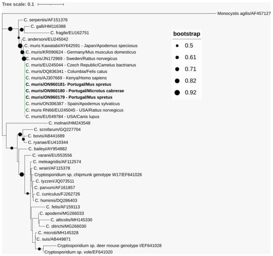 Phylogenetic analysis of SSU rRNA gene sequence fragments of Cryptosporidium muris characterized in this study (represented in bold) and sequences downloaded from GenBank. Inference was performed using a maximum-likelihood method and the Tamura-3-parameter model with discrete gamma distribution (alignment length: 475 nucleotides). Bootstrap values above 50% from 1000 replicates are shown at the nodes. Analyses were conducted via MEGA X, with editing via the Interactive Tree of Life (iTOL). Sequences are identified with GenBank accession numbers and, additionally, C. muris sequences with their country of origin and host. Monocystis agilis was used as the outgroup.