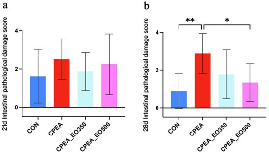 (a) 21d Intestinal pathological damage score; (b) 28d Intestinal pathological damage score. CON, control group birds fed a basal diet; CPEA, birds fed a basal diet and infected with Clostridium perfringens and Eimeria acervuline; CPEA-EO350, birds fed a basal diet supplemented with 350 mg/kg essential oils and infected with Clostridium perfringens and Eimeria acervuline; CPEA-EO500, birds fed a basal diet supplemented with 500 mg/kg essential oils and infected with Clostridium perfringens and Eimeria acervuline. Significant deviations are denoted by asterisks (* p < 0.05, ** p < 0.01).
