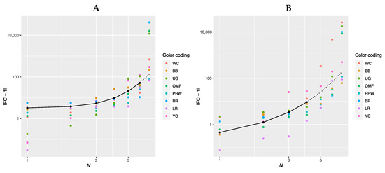 Log–log plots of a linear regression model for gene expression data (Table 2) in the eight breeds by muscle type (shown by a solid line). (A) Breast muscles (N = 1…6); |FC − 1|(N) = 0.12962 × exp(N); adjusted R2 = 0.5485. (B) Thigh muscles (N = 1…4); |FC − 1|(N) = 0.16990 × exp(N); adjusted R2 = 0.4220.
