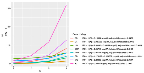 where N is a predictor variable conforming to the rank number for the genes under consideration; |FC − 1| is a dependent variable on N; a is an intercept (i.e., a variable that specifies the same offset for all |FC − 1| values and corresponding to the initial curve growth point) and K is a coefficient reflecting the slope of the graphical function and determining the growth characteristic for |FC − 1|. Conformity of the gene expression function to Equation (1) is a diagnostic sign of a fractal object [18,19,20]. At the same time, the fractal dimension can not only be an integer, but also fractional, which in our case justifies the use of the Euler’s number in Formula (1). In the second model, we used the conventional formula for calculating the fractal dimension:
