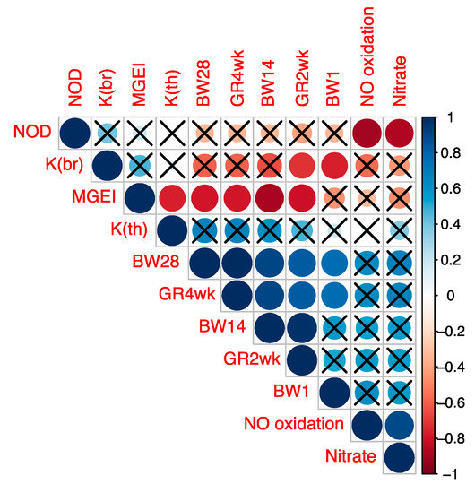 Spearman’s correlation coefficients between the studied indicators. Abbreviations: BW1, BW14 и BW28, body weight at 1, 14 and 28 days; GR2wk and GR4wk, growth rate for 2 and 4 weeks; NOD, content of NO donors; Nitrate, content of nitrate; NO oxidation, rate of NO oxidation to nitrate; K(br), K coefficient in the breast muscles; K(th), K coefficient in the thigh muscles; MGEI, myogenesis gene expression index expressed as the ratio K(br)/K(th). Significant correlations are not crossed out with the sign «×» (p < 0.05).