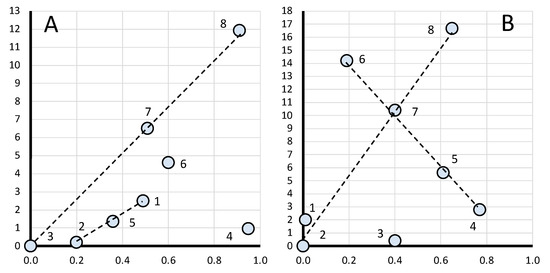 Fractal portraits of gene expression in the breast (A) and thigh (B) muscles of WC embryos. The X-axis shows the fractional parts of the shifted gene expression levels, and the Y-axis shows the full values of the shifted gene expression levels (Table S13). The numbers near the dots correspond to the gene numbering in Table S13. The dotted lines show that the corresponding genes belong to gene expression fractals, reflecting the fractal bioconsolidation of these genes.
