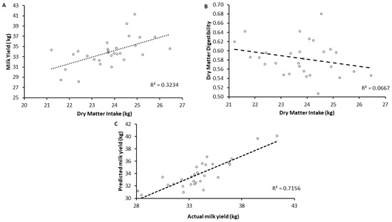(A) Simple regression between dry matter intake and milk yield, (Mean SE = 5.45; R2 = 0.323; Adjusted R2 = 0.298); (B) Simple regression between dry matter intake and dry matter digestibility, (Mean SE = 13.48.45; R2= 0.067 Adjusted R2 = 0.032); (C) Multiple linear regression to estimate milk yield through digested dry matter (DDM) and crude protein content, (Mean SE = 2.38; R2 = 0.716; Adjusted R2 = 0.694).