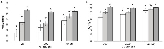 (A) Average milk yield (MY), achievable milk yield (AMY) and no feeding-limited milk yield (NFLMY) in low (L), medium (M) and high (H) production classes; (B) income over feed cost (IOFC), achievable income over feed cost (AIOFC) and no feeding-limited income over feed cost (NFLIOFC) in low (L), medium (M) and high (H) production classes. x, y, z Different letters between production classes stand for a significant difference (p < 0.05). Error bars represent the standard error for each production class.