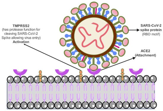 As previously stated, the canine susceptibility to SARS-CoV-2 infection is restricted, at least for older variants. Moreover, studies on experimentally infected dogs are inconclusive, with some showing asymptomatic infections with no clinical signs, no replication or transmission to contact animals, and no pathological changes at necropsy, resulting only in an antibody response, and others showing the converse, as previously discussed [53,64]. For example, five beagles were intranasally infected with SARS-CoV-2, and samples were collected over the following two weeks [65]. Between 2–6 days, SARS-CoV-2 viral RNA was post-infection (dpi) in three of the dogs from rectal swabs. Yet, during this testing period, virus isolation or virus detection in dogs remained negative based on oropharyngeal swabs or tissue autopsies—explaining the inconsistencies in studies. In addition, Chen et al. (2020) reported very low co-expression of ACE2 and transmembrane serine protease 2 (TMPRSS-2) target receptors in canine lung cells and mutations which are presumably responsible for the low receptors of the essential amino acid sequences in ACE2 receptors [90]. To improve understanding, the roles of ACE2 and TMPRSS-2 in the SARS-CoV-2 virus entry are illustrated in Figure 2.