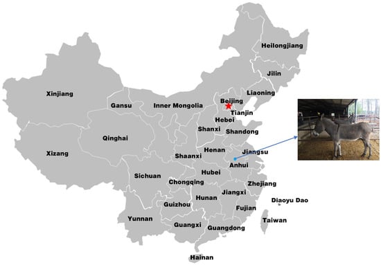 Samples were collected from Anhui Domestic Donkey Conservation and Breeding Co., Ltd., Anhui, China (Figure 1). The total genomic DNA was isolated using a blood DNA extraction kit (Tiangen Biotech Co., Ltd., Beijing, China) and stored at −20 °C. DNA integrity was evaluated via 1.5% agarose gel electrophoresis. The most variable region in the mtDNA D-loop of 60 samples was amplified using PCR. One female HGD was selected at random to determine the complete mitochondrial genome sequence.