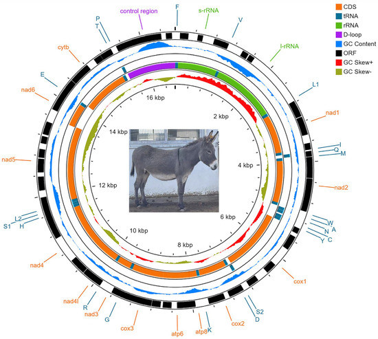 - Sun, Y.; Jiang, Q.; Yang, C.; Wang, X.; Tian, F.; Wang, Y.; Ma, Y.; Ju, Z.; Huang, J.; Zhou, X.; et al. Characterization of complete mitochondrial genome of Dezhou donkey (Equus asinus) and evolutionary analysis. Curr. Genet. 2016, 62, 383–390. [Google Scholar] [CrossRef] [PubMed]