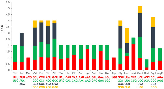 - Perna, N.T.; Kocher, T.D. Patterns of nucleotide composition at fourfold degenerate sites of animal mitochondrial genomes. J. Mol. Evol. 1995, 41, 353–358. [Google Scholar] [CrossRef] [PubMed]