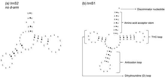 - Chan, P.P.; Lowe, T.M. tRNAscan-SE: Searching for tRNA genes in genomic sequences. In Gene Prediction; Methods in Molecular Biology; Kollmar, M., Ed.; Humana: New York, NY, USA, 2019; Volume 1962, pp. 1–14. [Google Scholar]