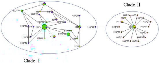 The 60 reference mtDNA D-loop sequences (Table 5) and HGD population sequences of 418 bp were compared to determine the relationships among the haplotypes and the population structure of HGDs. The MJN was constructed for the identified haplotypes. There were two distinct lineages (Clade I and Clade II) revealed by the MJN, and most HGDs were classified into Clade I (31 individuals (51.67%) and 4 haplotypes). Clade II included 29 individuals (48.33%) from 7 haplotypes (Figure 5).