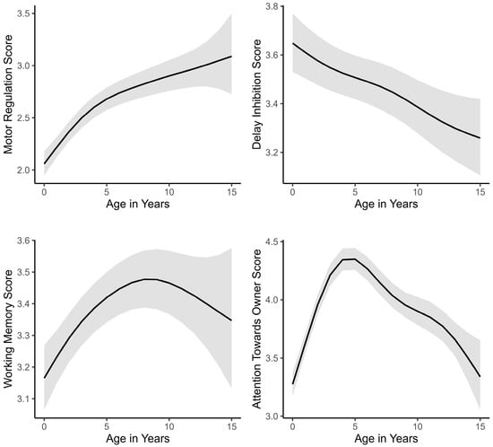 Estimated smoothing curves of the relationship of subscale scores for Motor Regulation, Delay Inhibition, Working Memory and Attention Towards Owner and dogs’ age in years. Solid lines are the smoothers and shaded regions indicate 95% confidence intervals.