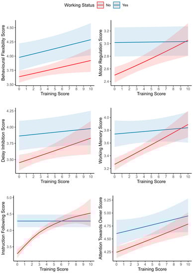 Estimated smoothing curves of the relationship of subscale scores and dogs’ Training Score by Working Status. Solid lines are the smoothers and shaded regions indicate 95% confidence intervals.